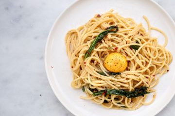 Carbonara sbagliata with fried garlic and rosemary crumbs